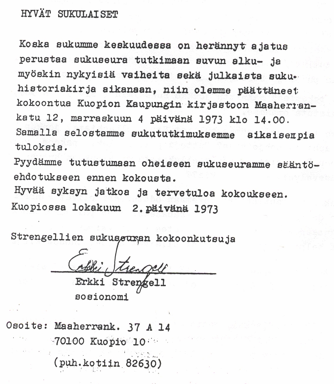 Strengellien Sukuseura Ry:n perustamiskokous 04.11.1973 Kuopiossa. Erkki Strengell kuvassa neljäs vasemmalta.Strengellien Sukuseura Ry:n perustamiskokous 04.11.1973 Kuopiossa.